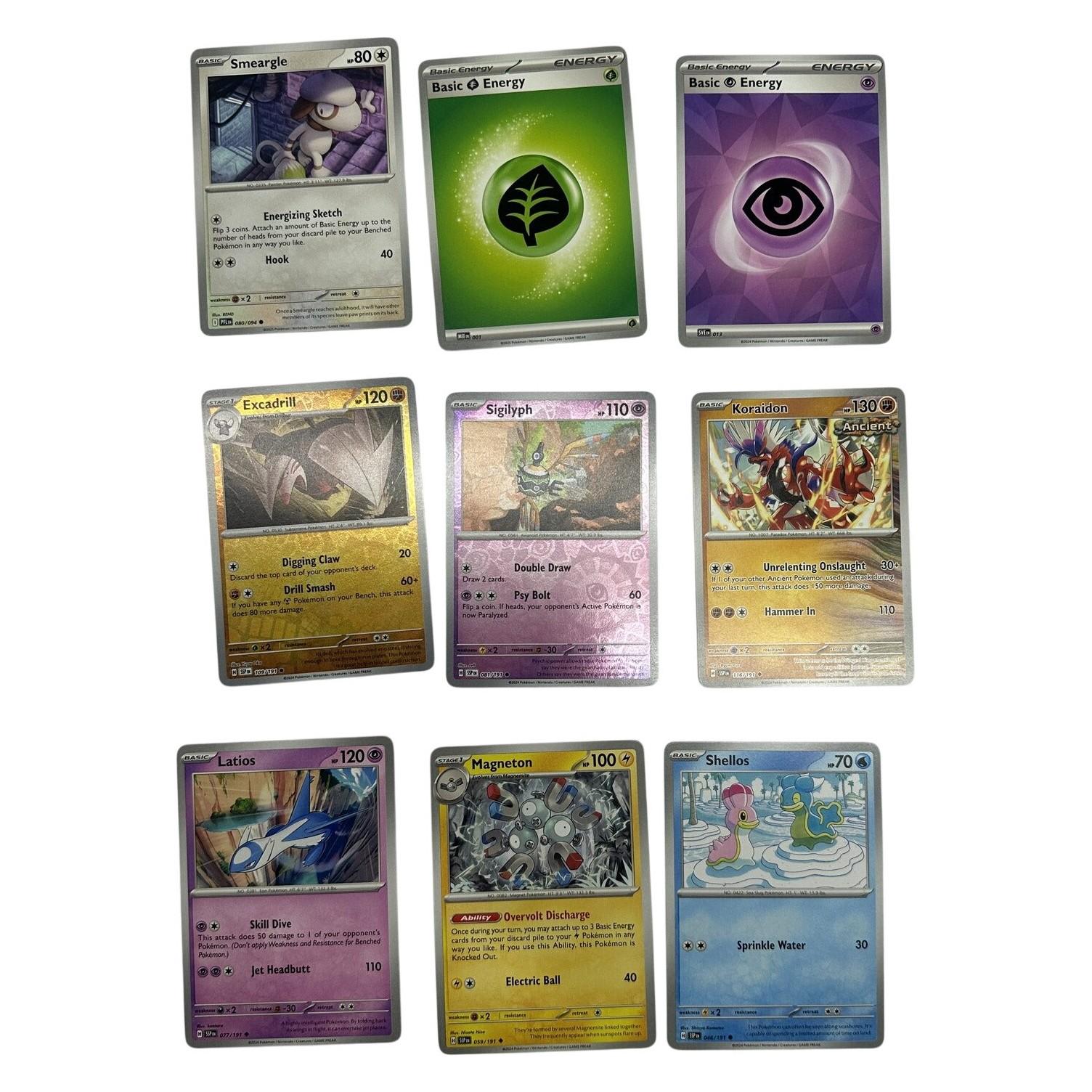 9 st. Pokémonkort Smeargle Latios Magneton Koraidon Sigilyph Excadrill Energi