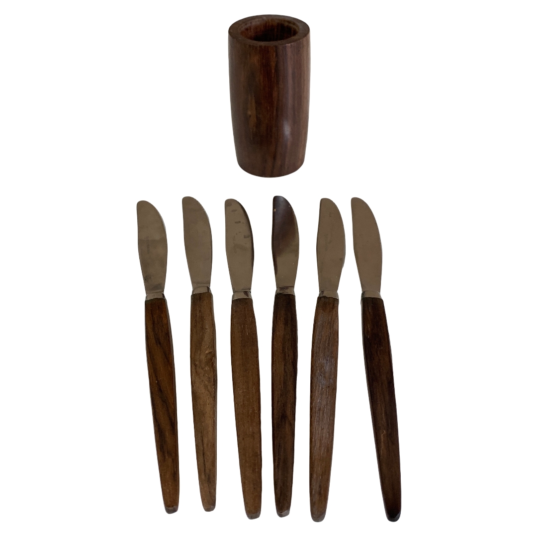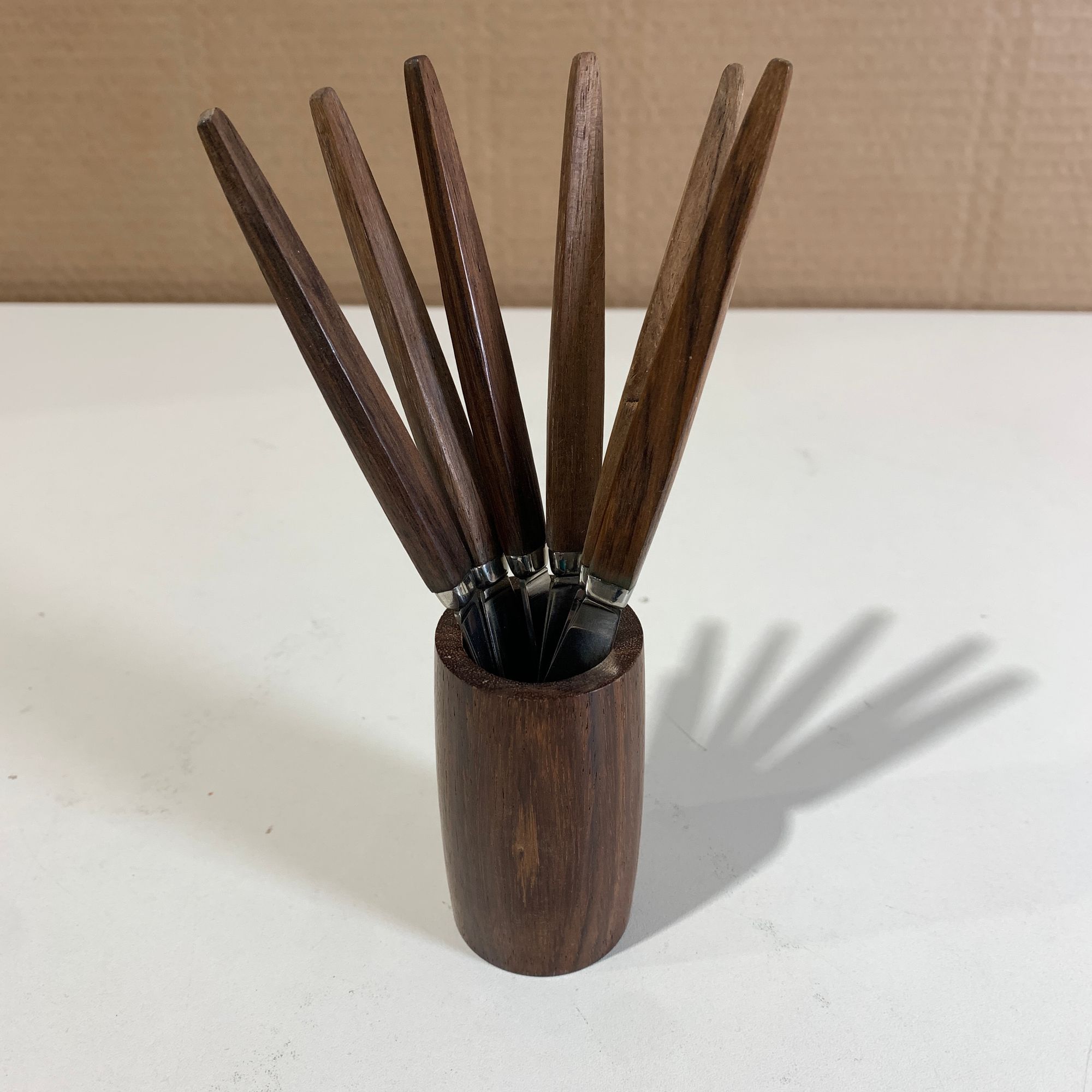 Kniv, längd ca: 17 cm.Stället, höjd ca: 8 cm och diameter ca: 4 cm.
