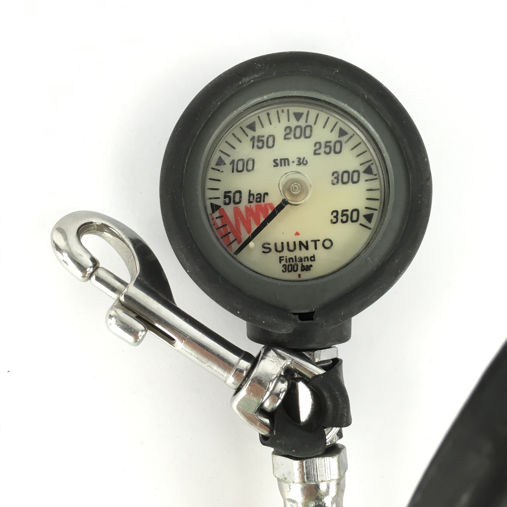 Med manometer från Suunto och inflatorslang till väst.
